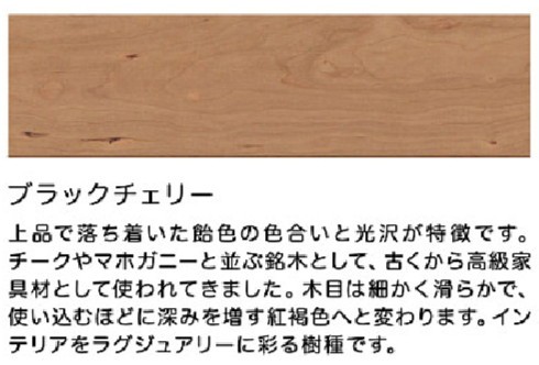 ブラックチェリー 上品で落ち着いた飴色の色合いと光沢が特徴です。 チークやマホガニーと並ぶ銘木として、古くから高級家具材として使われてきました。 木目は細かく滑らかで、使い込むほどに深みを増す紅褐色へと変わります。 インテリアをラグジュアリーに彩る樹種です。