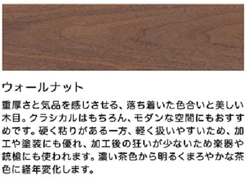 ウォールナット 重厚さと気品を感じさせる、落ち着いた色合いと美しい木目。 クラシカルはもちろん、モダンな空間にもおすすめです。 硬く粘りがある一方、軽く扱いやすいため、加工や塗装にも優れ、 加工後の狂いが少ないため楽器や銃槍にも使われます。 濃い茶色から明るくまろやかな茶色に経年変化します。