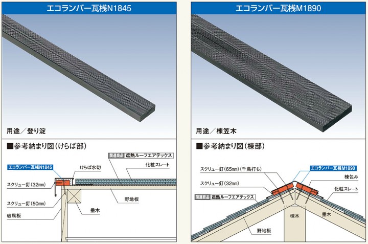 ● 樹脂製…エコランバー瓦桟は木材のように腐りませんので、建物全体の耐久性大幅アップにつながります。( 防腐処理の手間や取扱いの不便さを解消します。 )