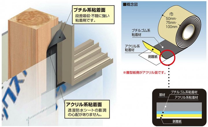 ブチル系・アクリル系粘着テープの両特性をひとつに集約。 通気層工法を採用している、主に住宅の開口部廻り防水用の防水テープです。 大切な住まいを、雨や湿気から守ります。 高粘着力で防水性にも優れ、水気を防ぎます。 ● 粘着性能、保持性能ともにアップ。季節を問わず、高い粘着保持性を保ちます。 ● 基材が薄くなりテープのしなやかさが向上。凹凸面への馴染みが良くなりました。 ● 両面タイプは手切れが可能です。 < 商品概要 > 呼称:ハイブリッド防水テープ 両面タイプ 75W 規格 ( 巾×巻長×長さ ):75mm×20mm×0.4mm 梱包内容:12巻入