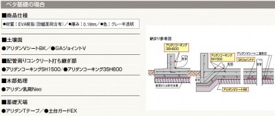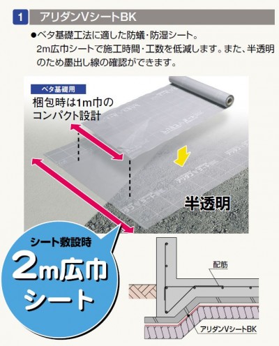 アリダンVシートBK ● 規格:2000mm×40m×0.18mm ● コード:ARVBK ● 材質::EVA樹脂(防蟻薬剤含有) ● 色:グレー半透明 ● 薬剤散布をしない安全な防蟻・防湿シート工法 ● 防蟻・防湿の二重効果を発揮 ● シロアリ経路の完全遮断 ● 効果完璧、保証は万全