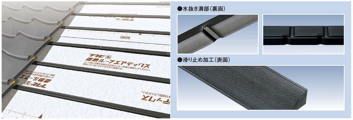● 水抜き溝…水抜き溝があるので瓦下に浸入する雨水を排出します。( 縦桟の施工の手間が省けます。※瓦桟K1530、瓦桟H4035、瓦桟H4028、瓦桟HT40100 )
