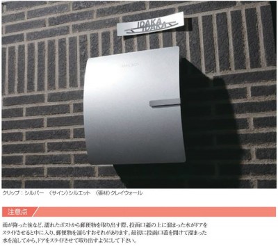 雨が降った後など、濡れたポストから郵便物を取り出す際、投函口蓋の上に溜まった水がドアをスライドさせると中に入り、郵便物を濡らすおそれがあります。