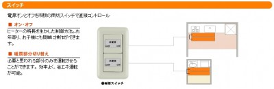 床暖房システム用スイッチ4個用 電源オンとオフを市販の両切スイッチで直接コントロール ■ ヒーターの特徴を活かした制御方法。お年寄り、お子様に簡単な操作ができます。 ■ 必要と思われる部分のみを運転させることができます。効率よく、省エネ運転が可能。 ツツミの床暖房 ・遠赤外線で身体の芯まで熱が浸透して温かい。 ・10分程度で床が温まってきます。 ・ピアノや家具のような重量物を置いても大丈夫。 ・メンテナンス不要。水をこぼしても大丈夫。 ・安心の10年保証付き ( コントローラーは2年保証 )。 ※施工は含まれておりません。