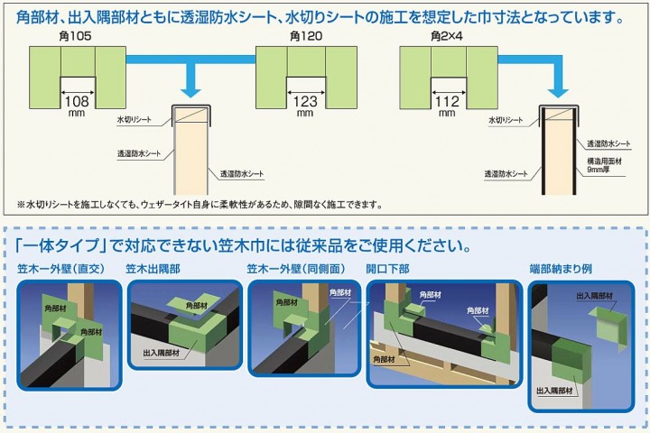 バルコニー取り合い部の防水対策は、一体成形カバー材でトータルに一挙解決! 漏水の原因となる三面交点。 ピンホール対策が確実な解決法。 角部材、出入隅部材ともに透湿防水シート、水切りシートの施工を想定した巾寸法となっています。 ※水切りシートを施工しなくても、ウェザータイト自身に柔軟性があるため、隙間なく施工できます。 < 商品概要 > 呼称:ウェザータイトバルコニー用 ( 一体タイプ )、出入隅120 対応笠木巾A:123mm 規格( 巾W × 高さH ×奥行D ):225×225×100 カラー:グリーン半透明 梱包内容:20個入り